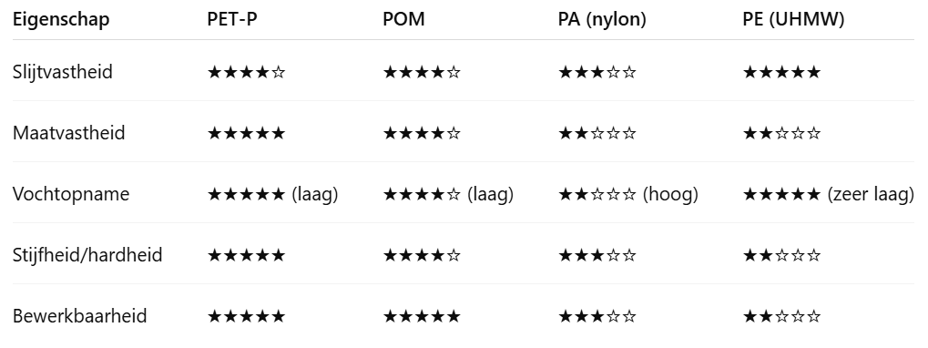 PE is zeer slagvast en slijtvast, maar relatief zacht en daardoor minder nauwkeurig te bewerken. PET-P is stijver, beter dimensioneel stabiel en daardoor geschikter voor precisieonderdelen.